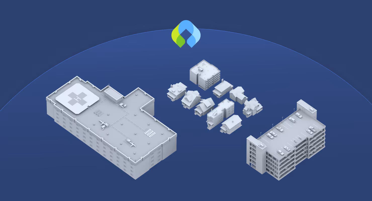 A 3D render of a hospital floor and a parking garage with lines leading to common locations Canopy devices would be located and utilized.